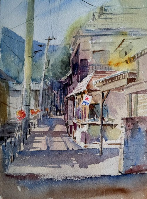 以前訪ねた伊豆の裏通り。氷屋さんの旗に吸い寄せられた暑い夏です。#スケッチ #風景画 #写生 #雲見 #氷 #路地裏 #透明水彩画 #水彩画 #watercolour #watercolor #sketch #kumomi #landscapepainting #aqurellepainting