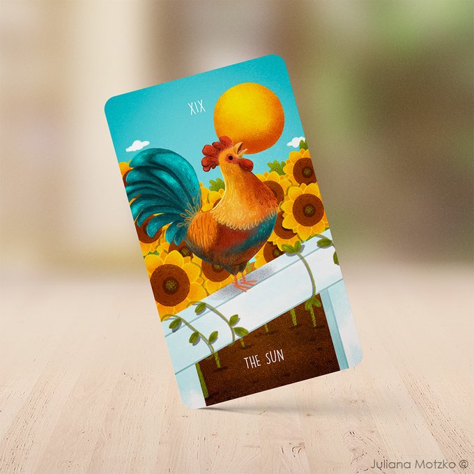 Another Tarot card that I created: The Rooster card, my version of The Sun card.☀️🐓 #TarotDeck #ArtLicensing #Tarot #Esoteric #Spirituality #Mystical #TheRooster #TheSun #Joy #MajorArcana #Owl #Oracle #OracleDecks #Illustration #illustrator #licensing #artist #JulianaMotzko
