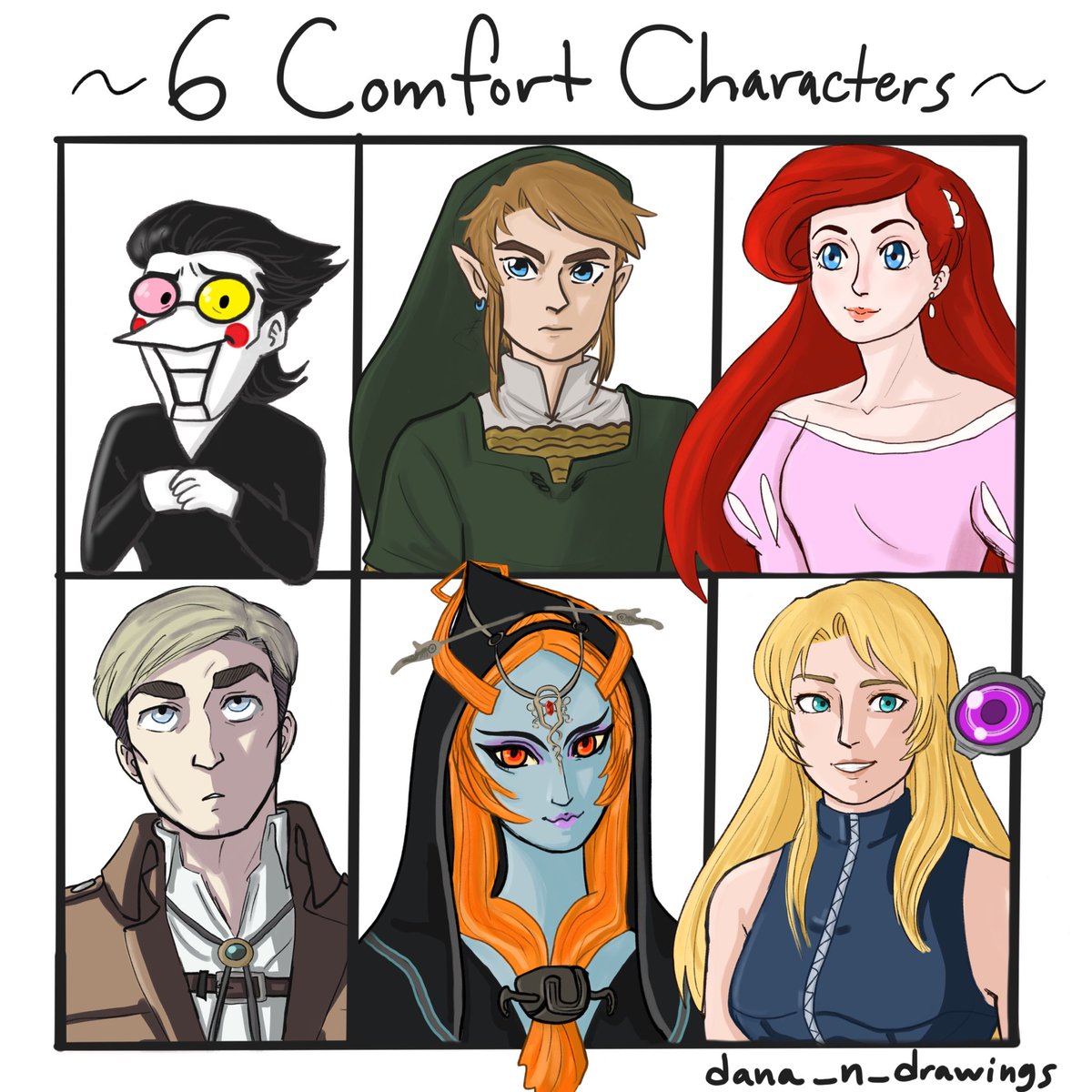 This took forever to do, but here it is! 6 (technically 7) of my comfort characters! #SixFanarts #sixcomfortcharacters #art #artmeme #loz #tloz #spamton #ariel #thelittlemermaid #aot #snk #erwinsmith #midna #samusaran #adammalkovich #metroid #link #deltarune #artchallenge