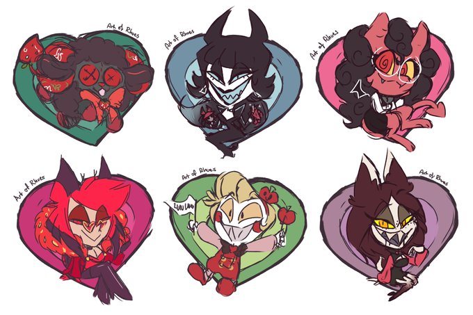 Scribbly pin concepts of friends OCs/AUs based on the chibi heart pins ❤️ Mer - @Mercurial_Missy Cerise - @BatsyBunny Sugar - @BlitzosMare Berryverse Al and Lulu - @StaticAppleSin Darling - @AlastorsDoe #HazbinHotelFanart #HazbinHotelAlastor #HazbinHotelLucifer #artofrhues