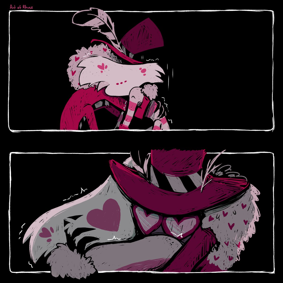 ❤️ A delightful little piece I got the pleasure to draw for the darling @LadyGValentine of their glorious gal with the devious deer lad ❤️ LadyG still needs some help with her vet bill so please go check out her gofundme! #HazbinHotelOC #HazbinHotelAlastor #radiodoe #artofrhues