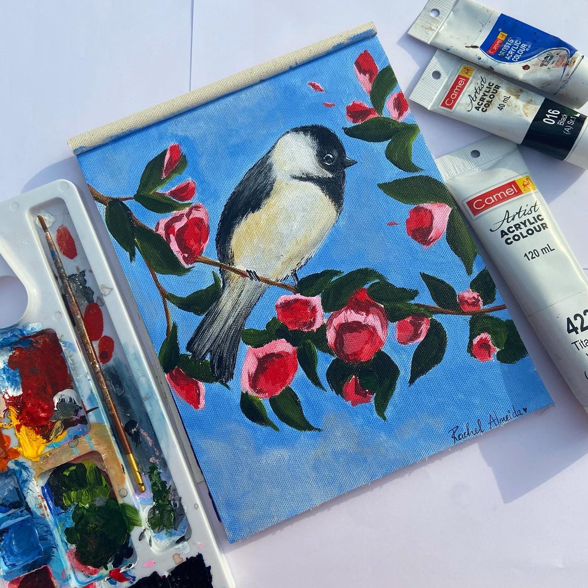 An absolute gorgeous lil bird study 💕 I often undermine my skills during the “trust the process” phase but the results always come through 🥺 #acrylicpainting #ArtoftheRogue #artistontwittter #art #artworld #artonsale #NFT #explorepage #birds #Flowers @Camlin_Official