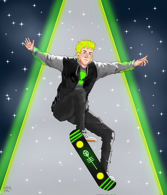 ✰ aliens gave Josh a hoverboard so he can bust some moves on them ✰ my piece for the #artswapv4 collab hosted by the incredible @orgorii !, original piece by @spookycocodun #cliqueart #twentyonepilots @joshuadun @twentyonepilots