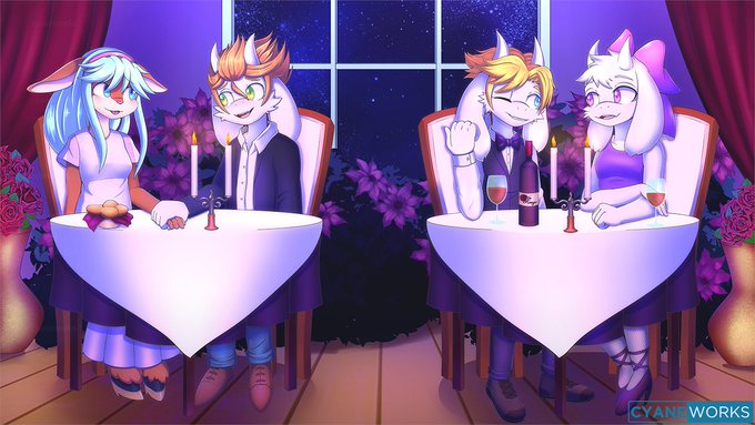 Commission for @RacerfanX and @lagooboy A quadruple date! uwu seems like Richard is still getting used to the idea of having a love interest! #lauriel #richard #asgore #young #toriel #background #date #dinner #fanart #digitalart #CLIPSTUDIOPAINT #undertale #art