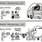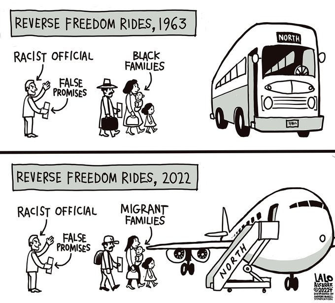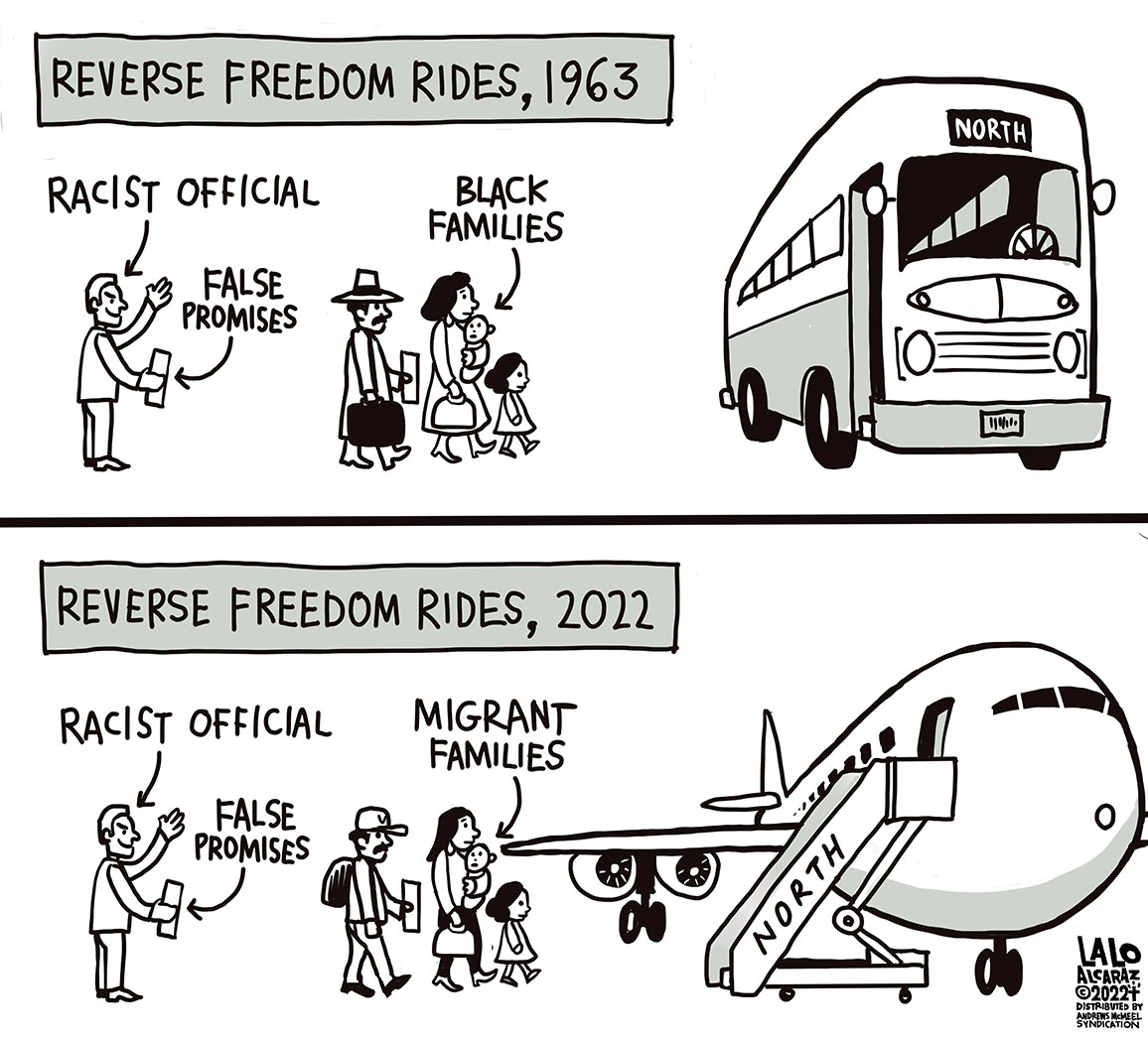 Reverse Freedom Rides, then and now. Please share #laloalcaraz cartoons! #DeSantisIsAFascistGhoul #Migrants #Asylum #immigration