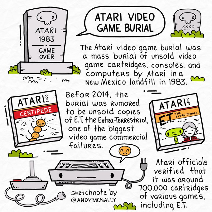 Atari video game burial sketchnote. The Atari video game burial was a burial of unsold video game cartridges, consoles, & computers in a New Mexico landfill site, by Atari in 1983. #sketchnotes #illustration #conceptsapp #videogames #atari
