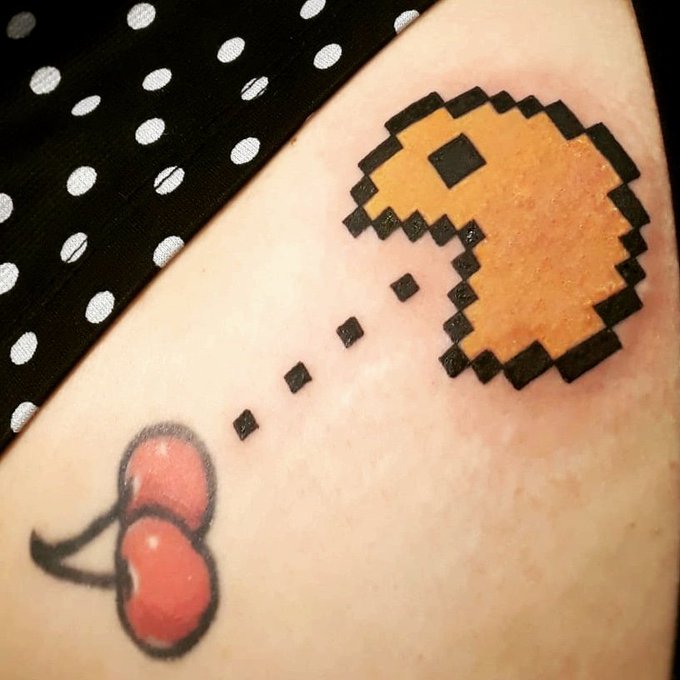 My new Tattoo by @marcolealtattoo Now my old cherry has a new meaning. #pixelartattoo #pacman #atari @atari