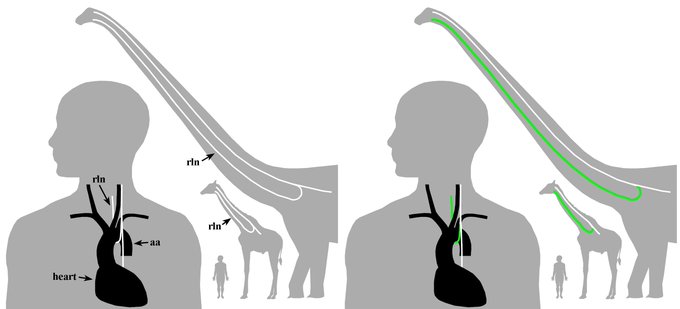If #dinosaurs are #tetrapods, that means they most likely had a recurrent laryngeal nerve. Even the #sauropods. This nerve goes from the brain all the way down the neck, around the heart & back up to the throat. A needlesly circuitous route! #Evolution #Paleoart #Sciart #Atheism