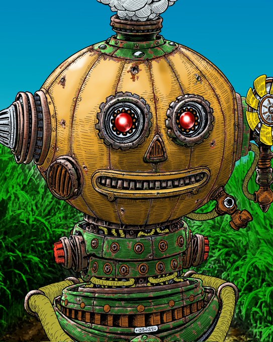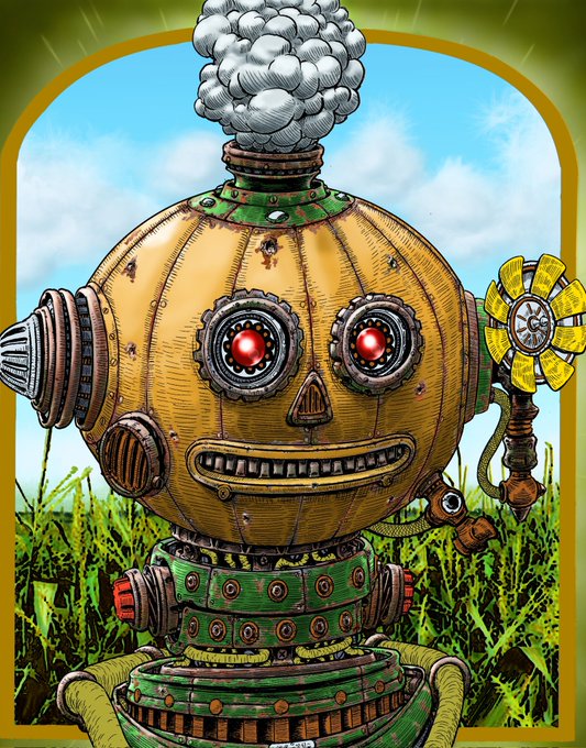 More details and background fiddling.🤓#neonseedstudios #steampunk #dieselpunk #raypunk #atompunk #inktober2021 #clipstudiopaintex #marchofrobots #mecha #mech #robot #bot #pumpkin #gourds #jackolantern #art #artist #drawing #tablet #ArtistOnTwitter #dailydrawing #artontwitter