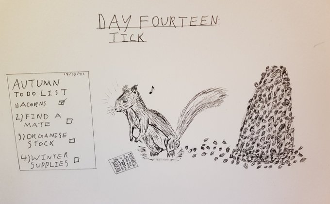 A squirrel on his To Do List for Autumn 2021. #inktober #inktober2021 #inktober2021day14 #inktober2021day14tick #inktober2021tick #inktobertick #tick #squirrel #autumn2021 #autumn #nature #inkdrawing #inkart #illustration #drawing