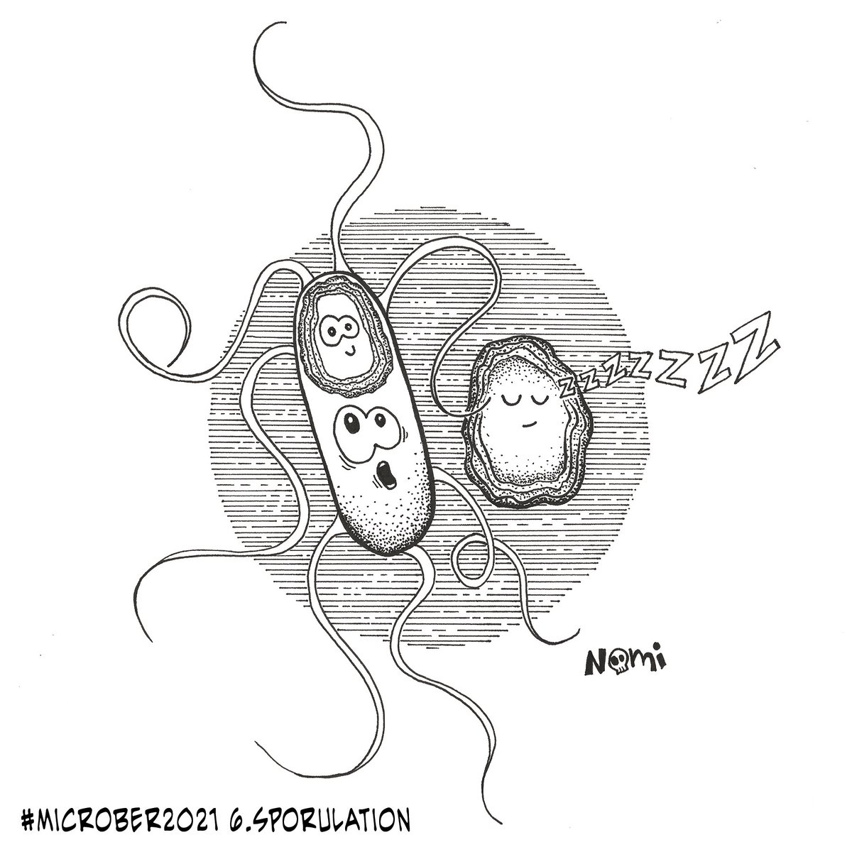 #Microber2021 day 6 - Sporulation When facing stresses, some bacteria can turn into spores. These spores are dormant form of bacterial cell that can cope with harsh environments. Here are a Bacillus endospore and spore :) #sciart #bacteria #inktober2021 #sporulation