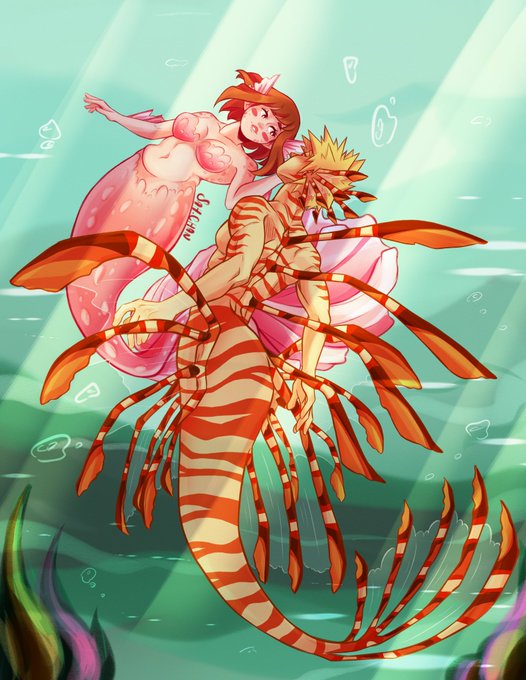 I didn't think I would have so much trouble with a drawing...but it's finally finished ~♡ #kacchako 🧜🏼♂️🧜🏽♀️🩷🧡 #bakugoukatsuki #urarakaochako #mermay2023 #mermaybnha #mermay