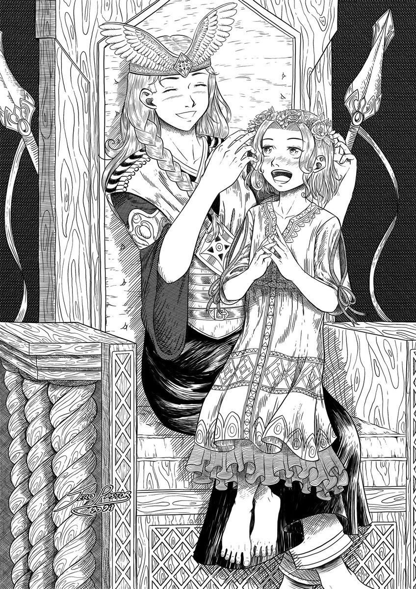 Siguiente #commission de la línea de versiones femeninas de dioses nórdicos. En esta ocasión: Frigg junto a una pequeña Baldr!! 🌸🌸 Próximamente versión a color!!! #ilustration #drawing #digitalart #norsemythology #frigg #baldr