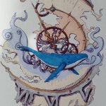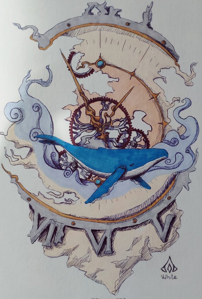Day 8 : Montre Ok... C'est plutôt une horloge. Ok... Y a encore une baleine. Que voulez vous 💜 #inktober #inktober2021 #inktober8 #montre #watch #destroy #steampunk #dessin #drawing #stylo #bic #whale #baleine