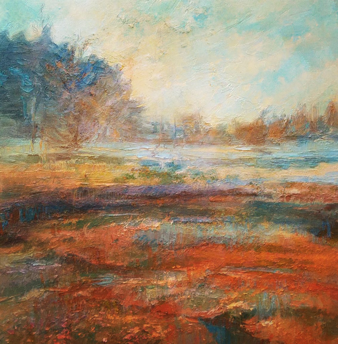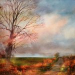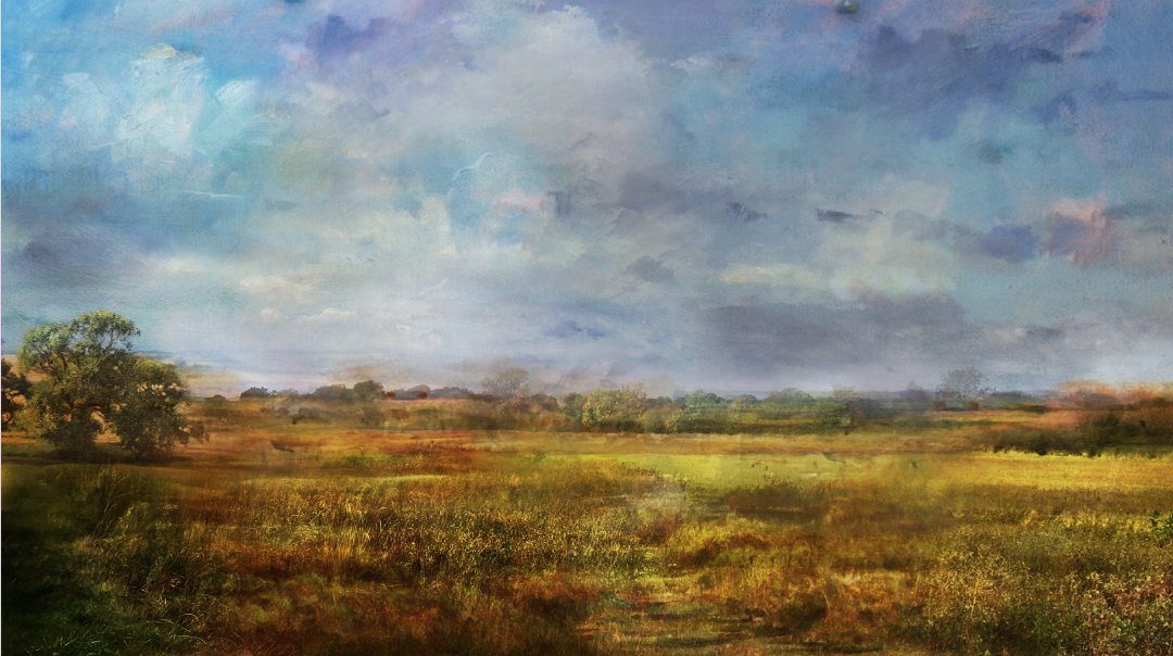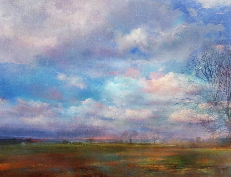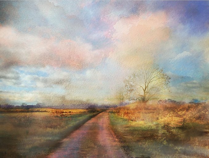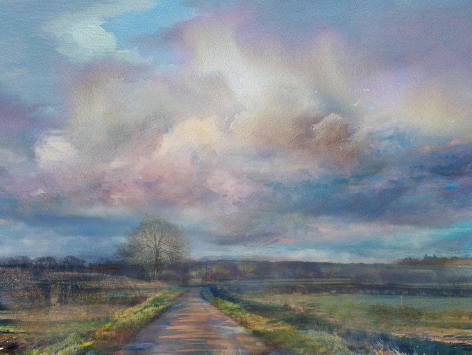 The Lane under early spring light, developing a sense of freshness and the prospect of warmer days, listening to whilst working @PillowQueens #art #barkby #leicestershire #mixedmedia #ArtistOnTwitter #gouache #watercolour #skyscape #landscapeart #contemporaryart #thelane