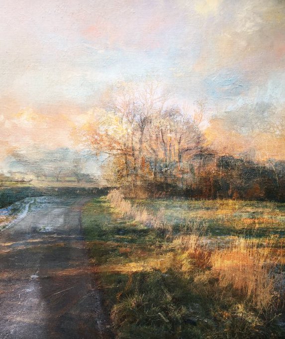 Two views of early winter light playing upon the lane, also looking at the transition of atmospheres, listening to whilst working @idlesband #barkby #leicestershire #gouache #watercolour #ArtistOnTwitter #mixedmedia #LandscapeArt