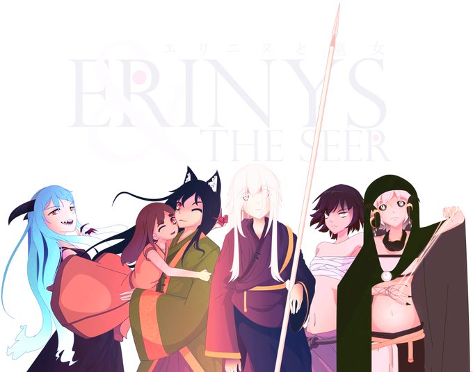 The good gods. #ErinysAndTheSeer Left to right: Apollo (as Satan) Cherry (devotee to Nektar) Nektar Athena Teiresias Erinys #anime #AnimeArt #conceptart #characterdesign #characterart #oc #Satan #Apollo #Bastet #Nektar #Athena #Teiresias #Erinys #ArtistOnTwitter #イラスト