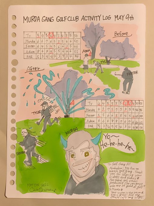 'MURDA GANG GOLF CLUB ACTIVITY LOG May 9th'🏌️♂️💦😂 @murdabeatz @TylerArmes @ManOhManFoster @adamhalliday_ #murdabeatz #murdagang #musicproducer #dj #beatmakers #hiphop #trapmusic #fanart #drawingaday #1日1絵 #ペン画 #お絵描き #イラスト #nft #nfts #golf #golfgang #goodshot