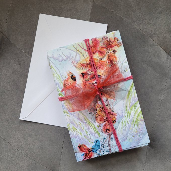 Here's how the cards look. Thank you for preorders! #greetingcards #artwork #artist #animalart #watercolorpainting #redcardinal #birdwatching #BirdsSeenIn2021 #birbs