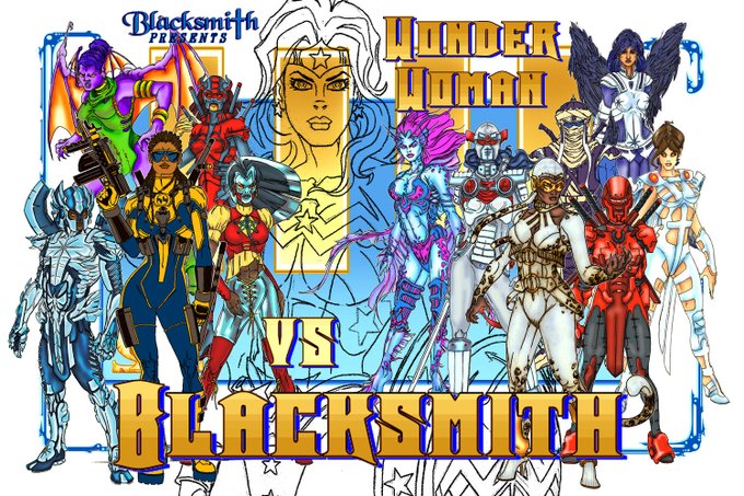 Visit BlacksmithENT.com "Wonder Woman vs Blacksmith" By Chad K. Collins Left: - Raya - Kahn - Uozi - Metro - Coven Right: - Moray - Tyranny - Bedlam - Raven - Snow - Carnage - Trinity #wonderwoman #comicart #theblacksmithuniverse #nerds #cosplay #blackgirlmagic #blerds