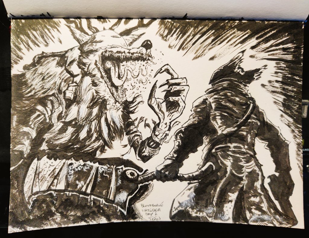 It's Bloodborne for PlayStation Inktober day 22! I went a little overboard here with the inking but I had fun! Depicted a Hunter and Vicar Amelia as she kicked my butt when I played the game for the first time this year! #Bloodborne #FromSoftware #Bloodbornefanart #inktober2022