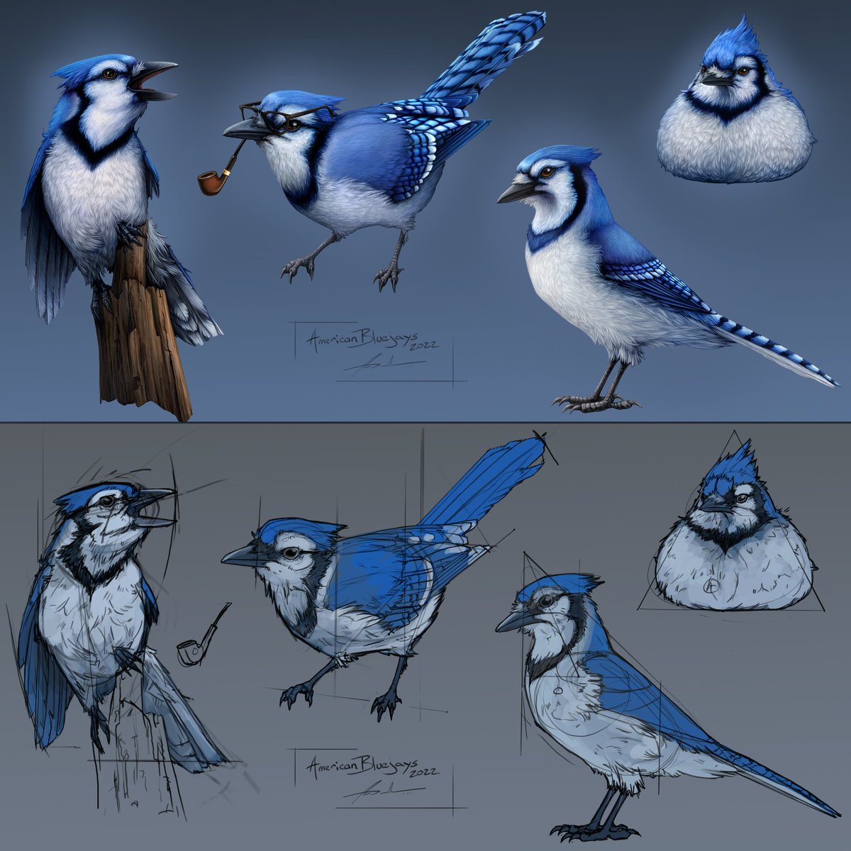 Because I'm a sap for studies, sketches, and progress images from artists. Here are the 4 Bluejay's for @BlueJayvideos side by side comparison. Started in February 2022. Its taken me awhile to render, but every ounce worth it! #BlueJays #birdart #digitalpainting #ornithology