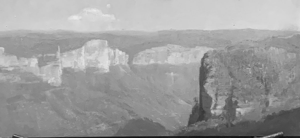 On the easel - wip - adjusting tones and colour - or painting in other words :). Oil on board - Grose Valley looking west from Mt Banks- #oilpainting #bluemountains #landscapepainting