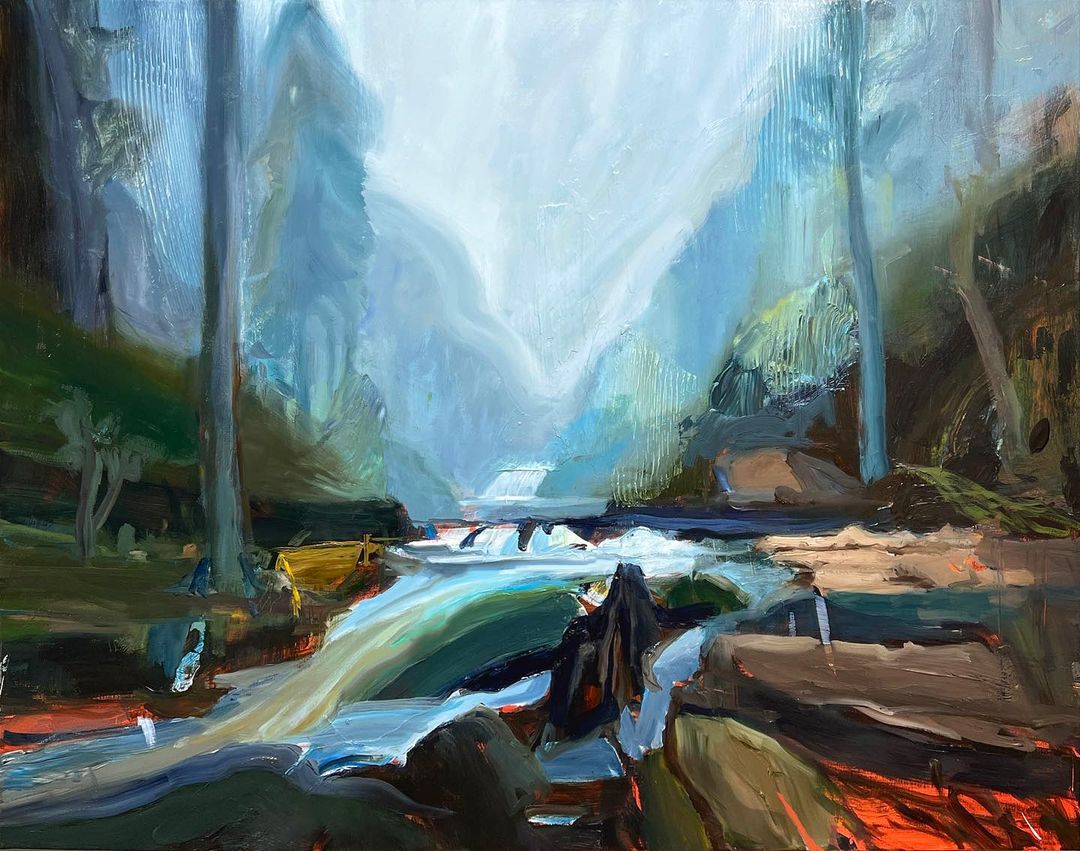 The steady rain has filled the rivers and the gentle sound of rushing water echoes in the canyons… “Upstream”, 65X85cm, oil on polycotton. #landscapepainting #bluemountains #wentworthfalls #blackheath #landscapepaintings #richardclaremont #sydneyartist #oilpaint