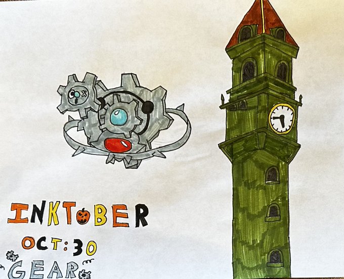 My 8th grader is taking over my Twitter for #inktober2022 one more to go!! Day 30 #gear #pokemon #klinklang #medfieldinktober #medfieldps #bmsed