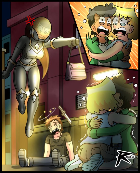 "Will you two stop screaming!? I'm the good guy, you dimwits!" After that night, Amanda decided to change her suit colors to look more heroic. lol #LadyAce #LoriLoud #BobbySantiago #OC #OriginalCharacter #SuperHero #TheLoudHouse #ArtistOnTwitter #DigitalArt #MyArt #RaishaGS