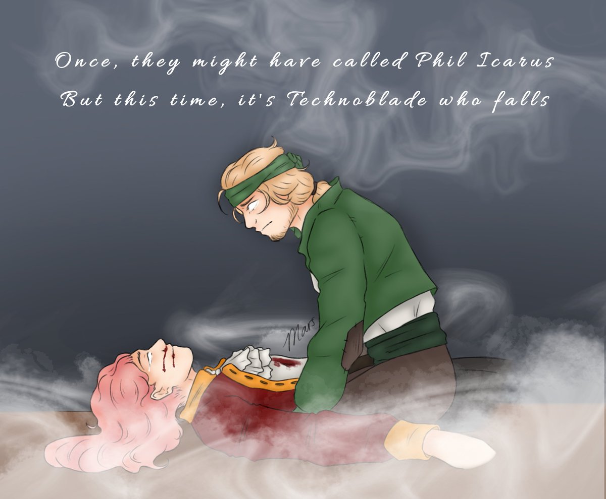 // blood "Once, they might have called Phil Icarus. But this time, It's Technoblade who falls." ___ Bones Art!! #technofanart #philzafanart #bonesau