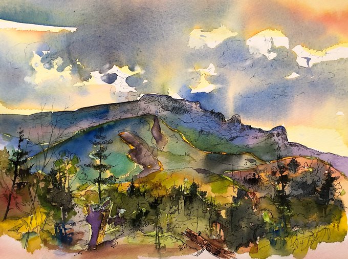 A new pen-ink-watercolor wash of Grandfather Mountain Profile on Kilamanjaro paper from @cheapjoesartstuff w/ #americanjourneywatercolor going to @brframeworks #ncartists #weswaugh #boonenc #grandfathermountain #watercolor #penandwatercoloursketch #mixedmedia