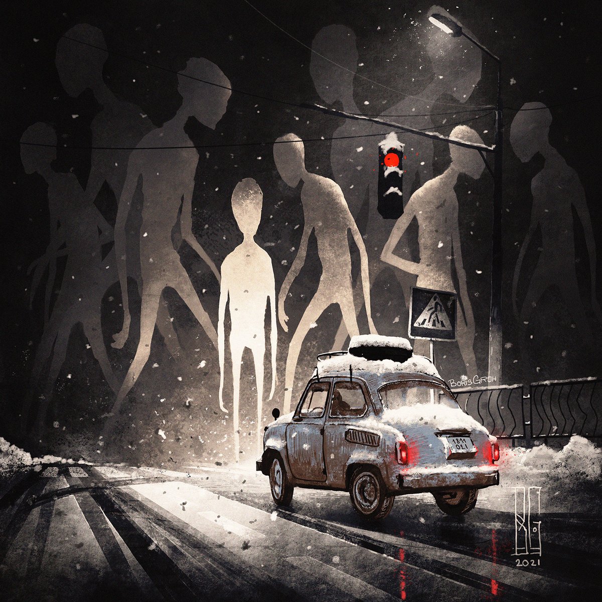 "Red Light" 2021 Available on Artstation prints, link in bio. #art #digital #night #winter #creepy #horror #borisgroh #procreate
