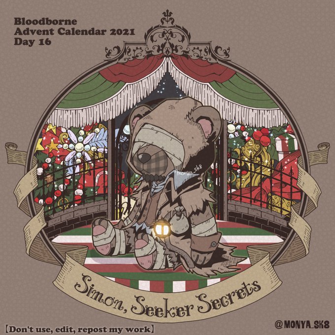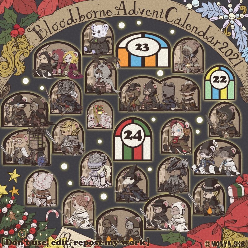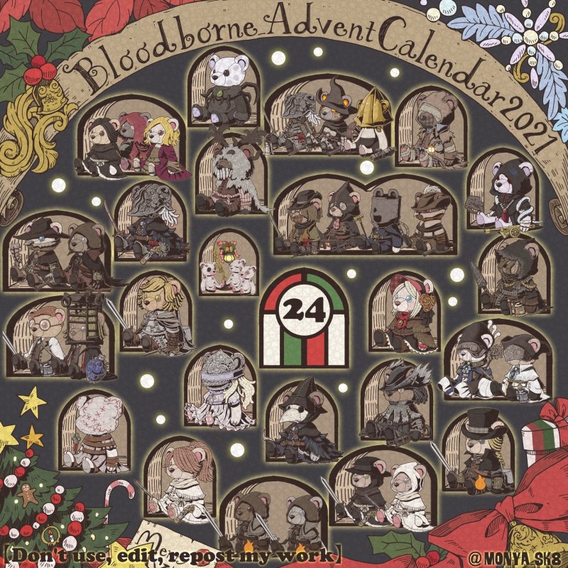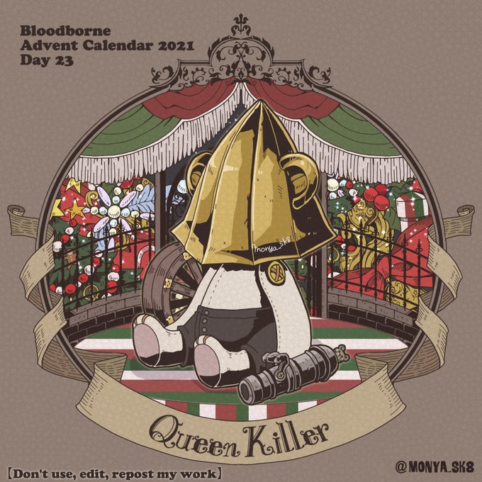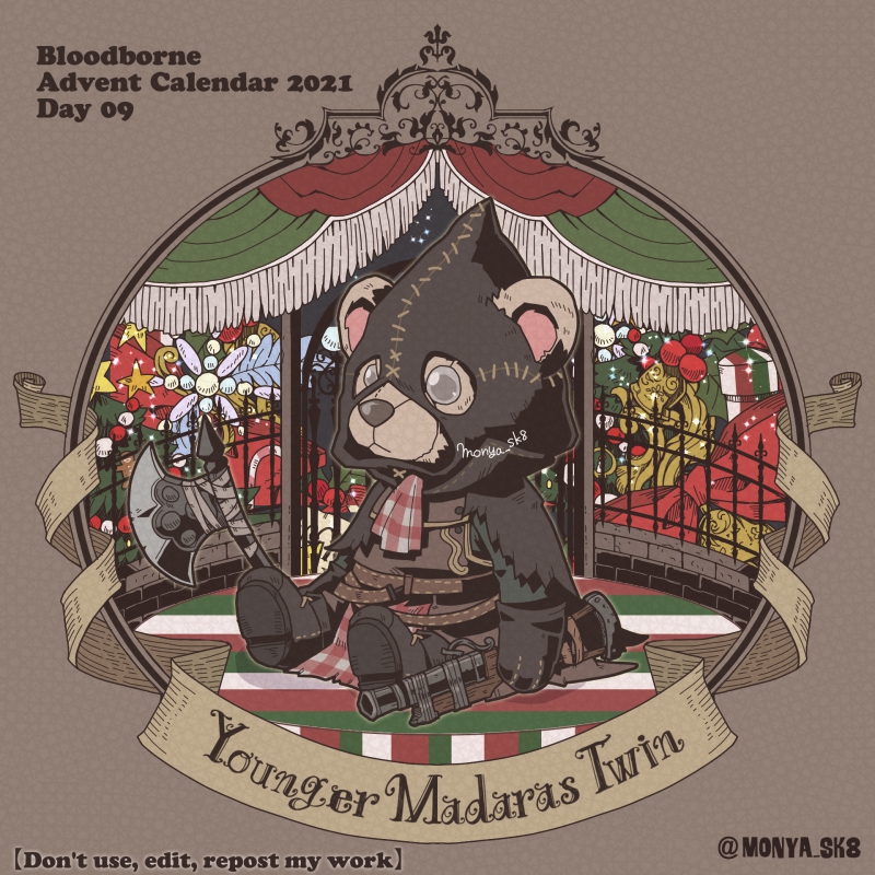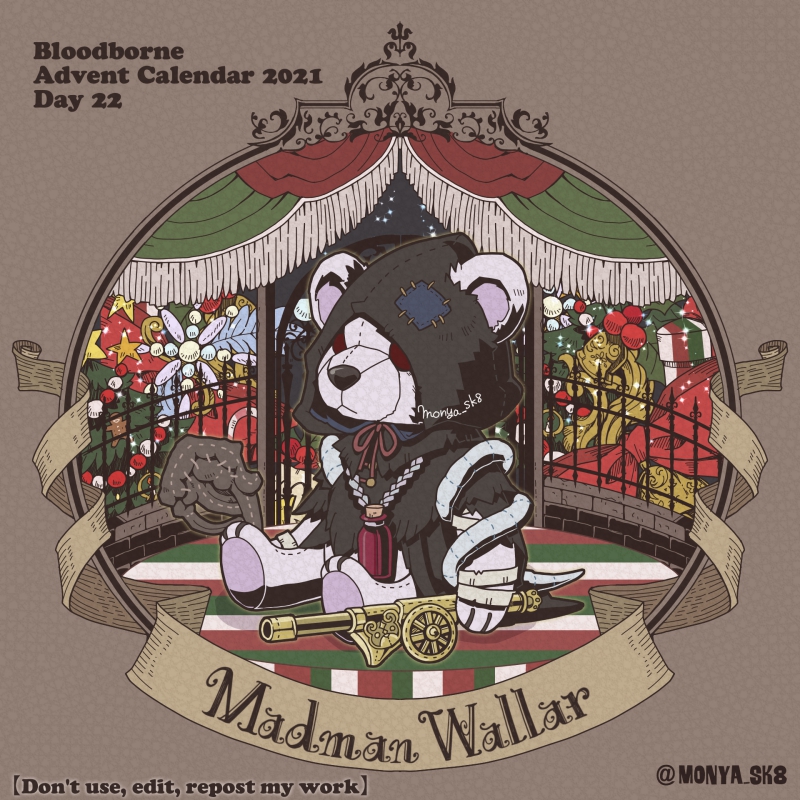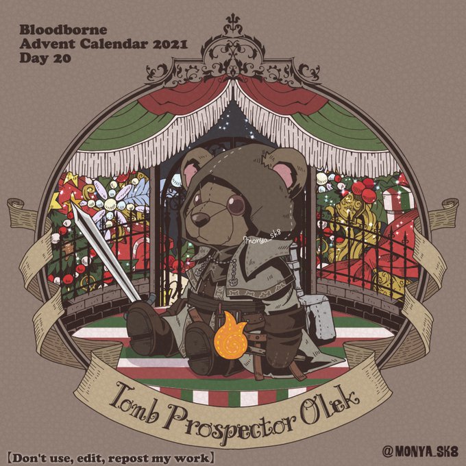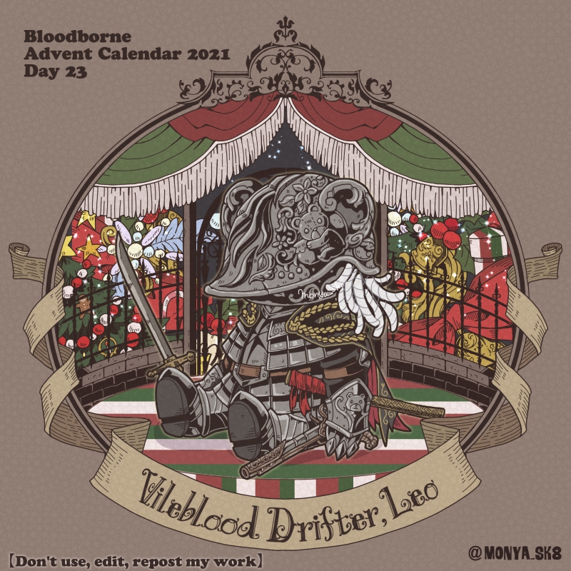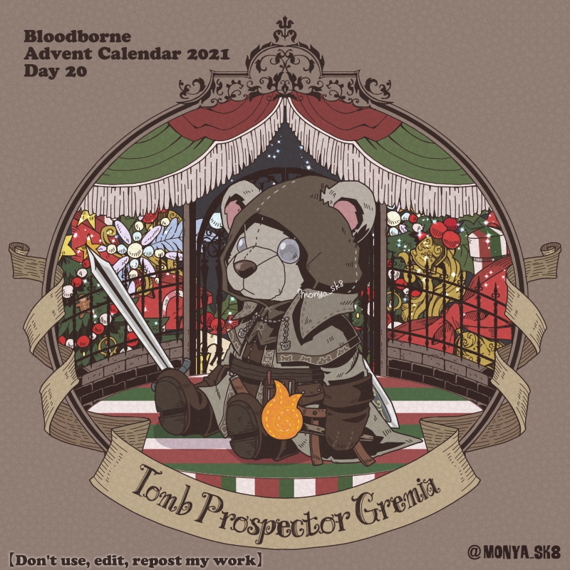 Day23:女王ごろし、骨炭の狩人、カルラ、さまよえる血の狩人レオー 〜Queen Killer、Bone Ash Hunter Carla、Vileblood Drifter Leo 地底腐臭枠ではお馴染みのこの3🧸 敵対の方はアルデオマンらしいですがまぁクイーンキラーでいいかということで! 地底で会おう! #borneadvent21 #もにゃ絵