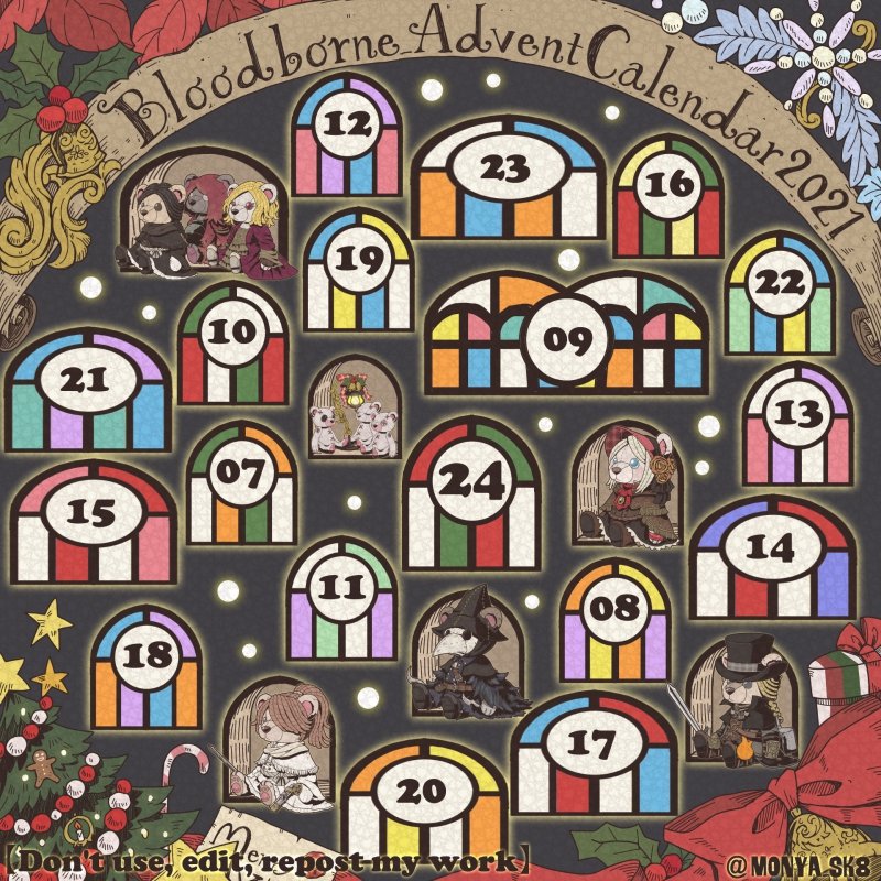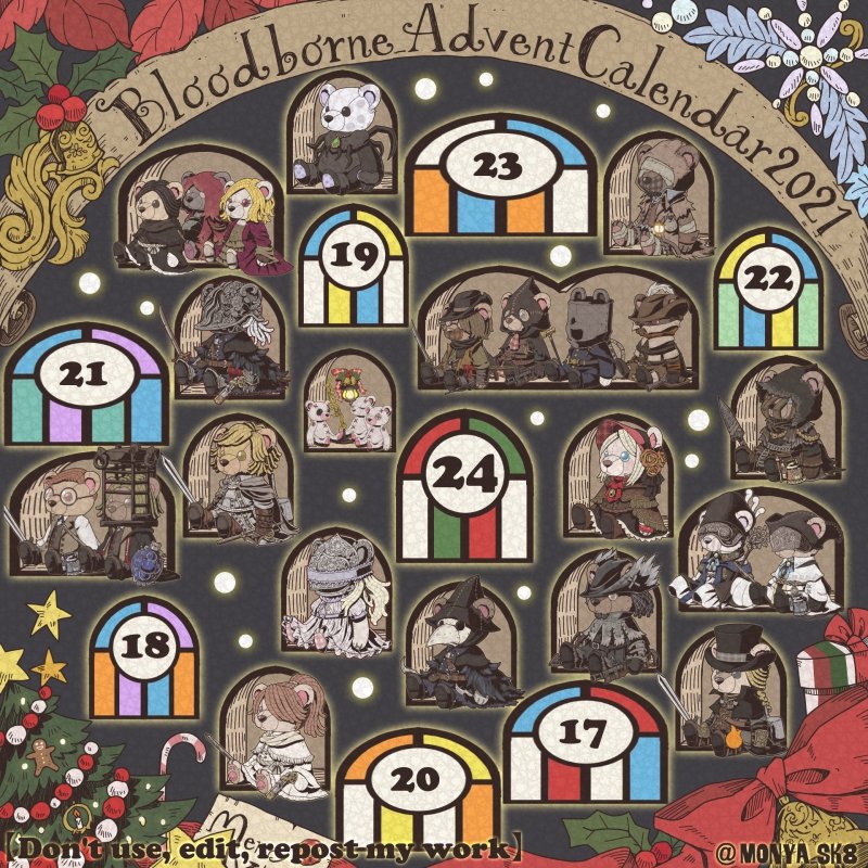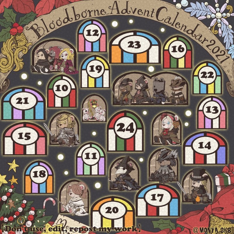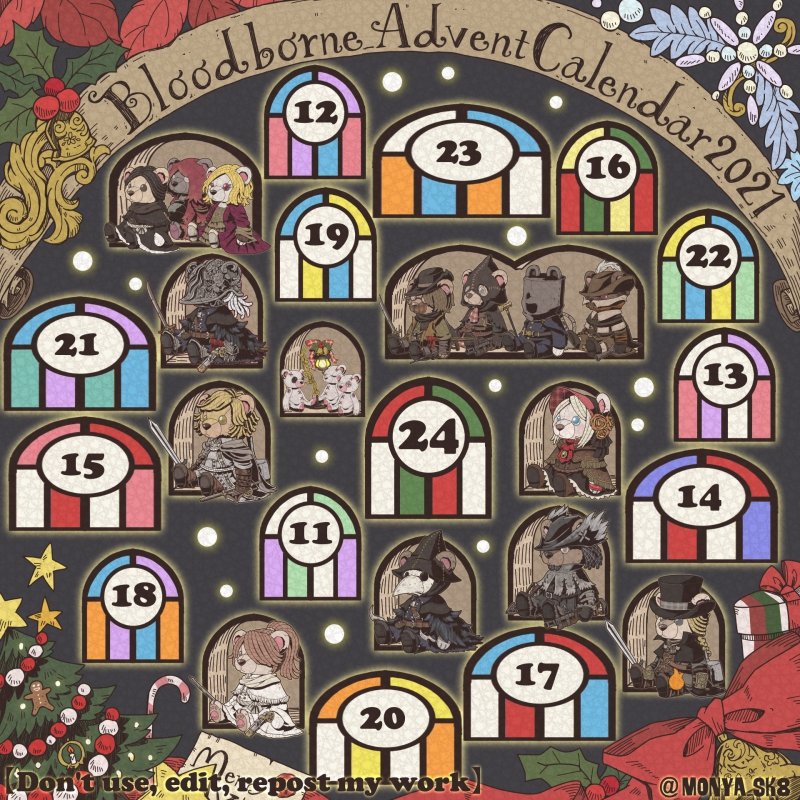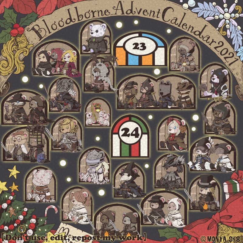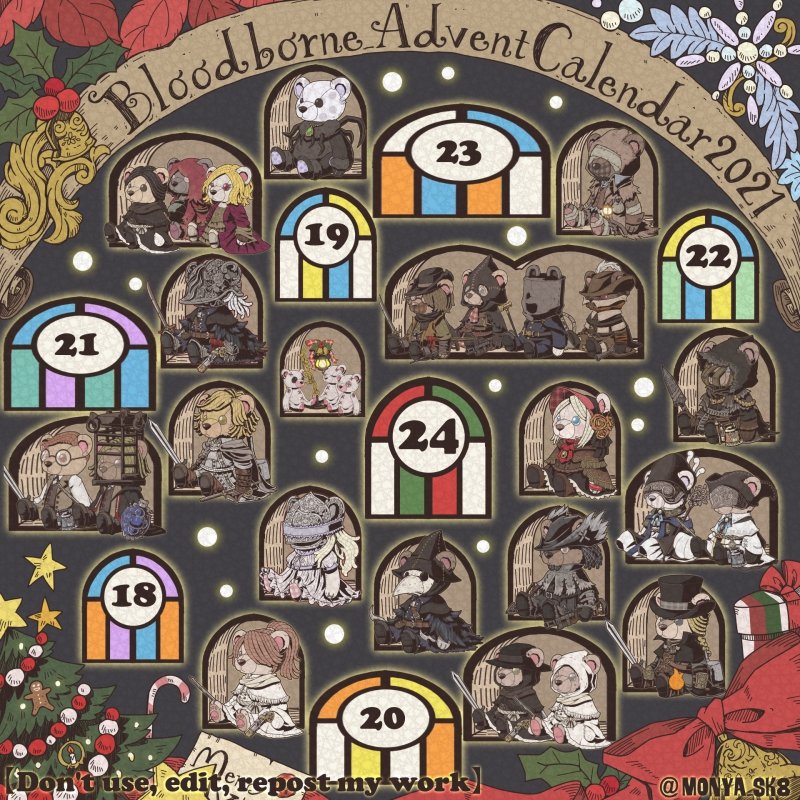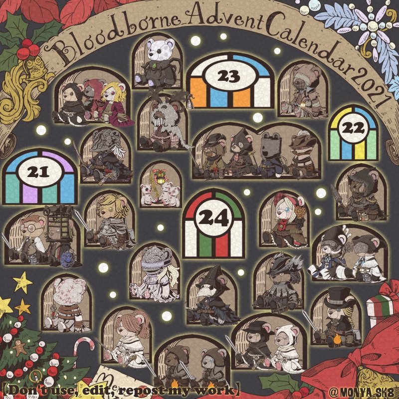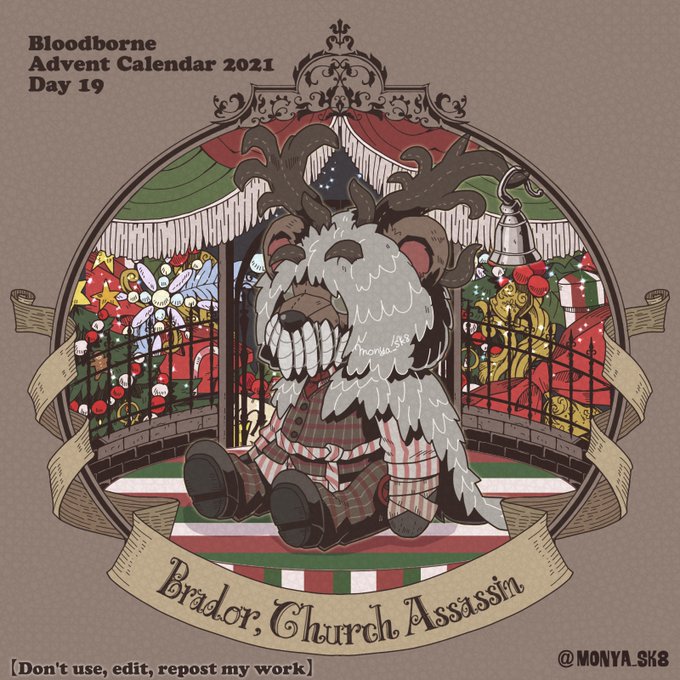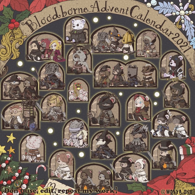 Day23:女王ごろし、骨炭の狩人、カルラ、さまよえる血の狩人レオー 〜Queen Killer、Bone Ash Hunter Carla、Vileblood Drifter Leo 地底腐臭枠ではお馴染みのこの3🧸 敵対の方はアルデオマンらしいですがまぁクイーンキラーでいいかということで! 地底で会おう! #borneadvent21 #もにゃ絵