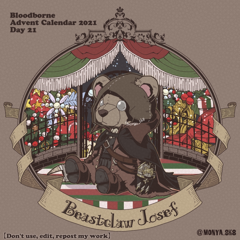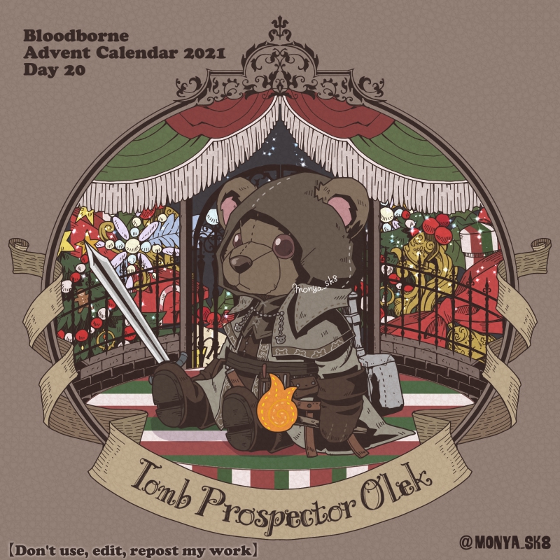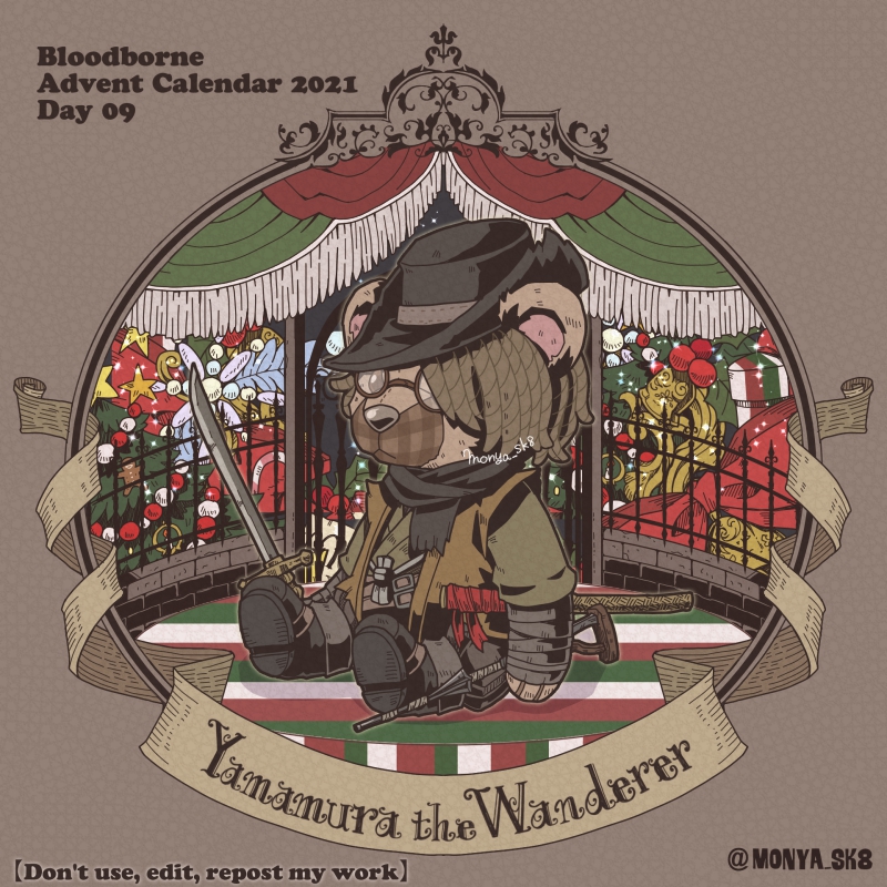 Day08:古狩人デュラ〜Retired Hunter Djura〜 デュラくまさん。 旧市街の時計塔からこのクマが見張ってると思うと。。。w ボスシリーズと比べてNPCは色が地味ですねぇ #borneadvent21 #もにゃ絵