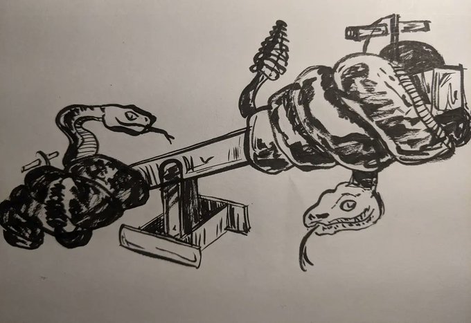 #inktober 20, teeter totter rattlesnakes. Using the AI bot animals prompt this year. #drawtober #drawtober2021 #botober #botober2021 #inktober2021