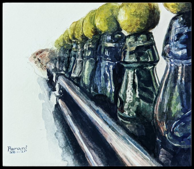 Spirit ~ A solution of volatile components extracted from something, typically by distillation. Take care not to drink your brush cleaner ~ #inktober #inktober2021 #spirit #inktober2021spirit #bottles #spiritbottles #empty #thereinspirit #dippen #ink #pencilcrayon