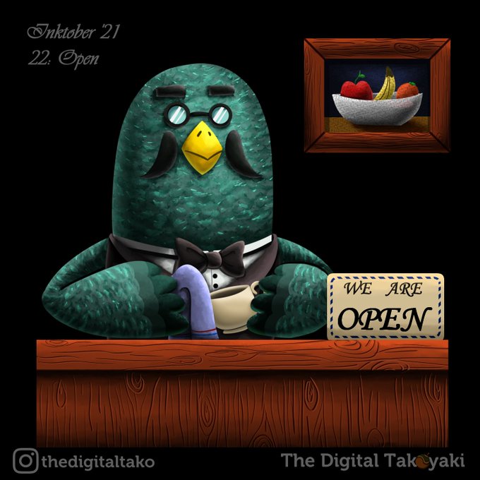 Inktober 22: Open We are (almost) open Estamos (casi) abiertos (ほとんど)営業中 #Inktober #inktober2021 #illustrations #digitalart #イラスト #アート #Ilustración #artedigital #イラスト好きな人と繋がりたい #animalcrossing #ACNH #Brewster #coffee #どうぶつの森 #あつ森 #マスター