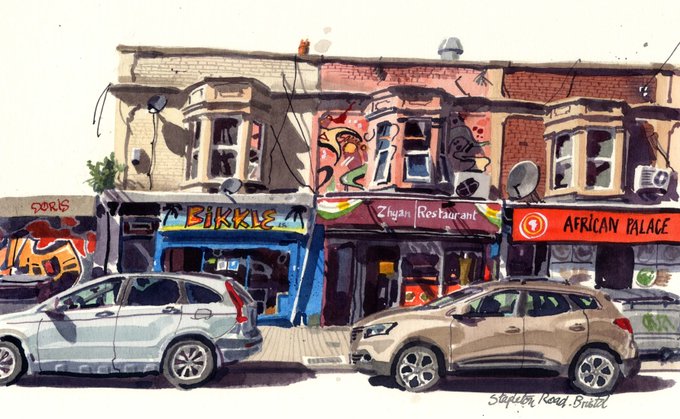 #StapletonRoad once described as the most dangerous street in the UK. #Worldfood @sajidjavid once lived there. #Bristol #InkDrawing