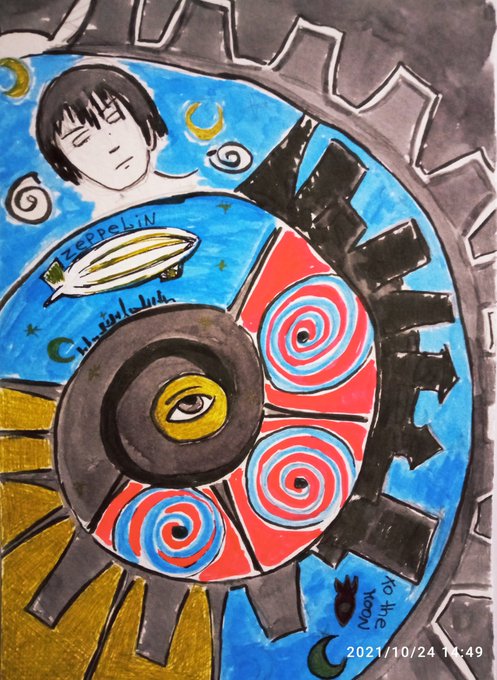#BUCKTICK #GOGOBTTRAIN #inktober #inktober2021 #bucktober 24. Empire of Light. Ammonite, gears, dark houses under a blue sky, space, spirals, dreams and a rocket to the moon.