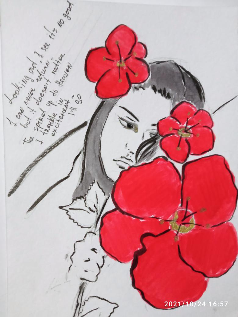 #BUCKTICK #GOGOBTTRAIN #inktober #inktober2021 #bucktober 28 day. You with a hibiscus in your hair Suicide in despair in the sunset Until the bones of my spine groan and grate Hold me, won’t you kiss me and forgive me...