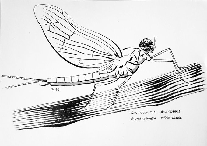 Si hay alguien que sabe que la vida es corta son los #Ephemeroptera el 3er orden de #insectos para #inktober2021 con unas 3330 spp. Tienen ninfas acuáticas, los adultos terrestres no se alimentan y viven apenas 24h ⌛#bugsarecool #insects #drawing @ento_e