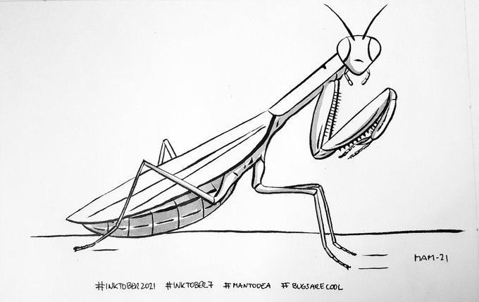 Completamos la primera semana #inktober2021 con el 7º orden de #insectos: #Mantodea con 2400 spp. reconocidas y originados hace 60 ma y que incluye las muy conocidas "mantis" #insects #mantis #bugsarecool #entomologodeguardia #drawing @ento_e