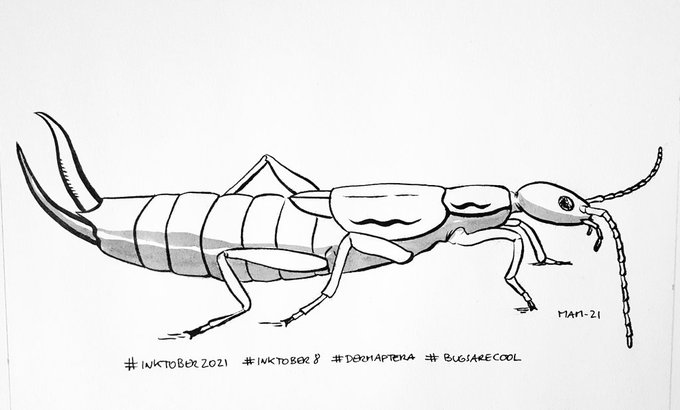 Tijeretas, cortapichas, rapaculos, papanòvies son nombres que se les da a #Dermaptera el 8º orden de #insectos para #inktober2021 Tienen 2000 spp. y aparecieron hace 200 ma; las pinzas abdominales son inofensivas ✂️✂️#insects #tijeretas #earwig #bugsarecool #drawing @ento_e