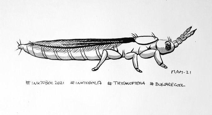 Vamos por el orden 17º #Thysanoptera #insectos muy conocidos por los agricultores por ser plagas principales y grandes transmisores de viroses. Tienen 5600 spp y se originaron hace 250 ma. #inktober2021 #insects #trips #bugsarecool #entomolodeguardia @ento_e