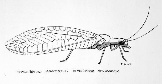 Vamos a por el orden 22º los #Neuroptera son #insectos depredadores en el que las larvas y adultos son el terror de los pulgones de los cultivos. Tienen 6000 spp. y se originaron hace 300 ma. #inktober2021 #insect #lacewing #bugsarecool #entomologodeguardia @ento_e