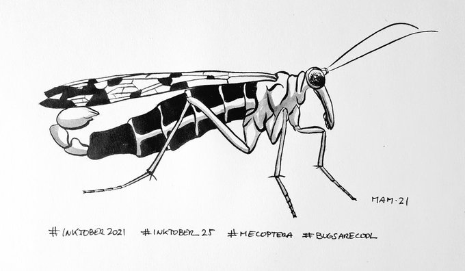 Otro de esos órdenes de #insectos curiosos: #Mecoptera (25º) llamados "moscas escorpión" por la terminalia del macho pero que es inofensiva. Unas 600 spp. y originados hace 45 ma. #inktober2021 #insects #scorpionfly #bugsarecool #entomologodeguardia @ento_e