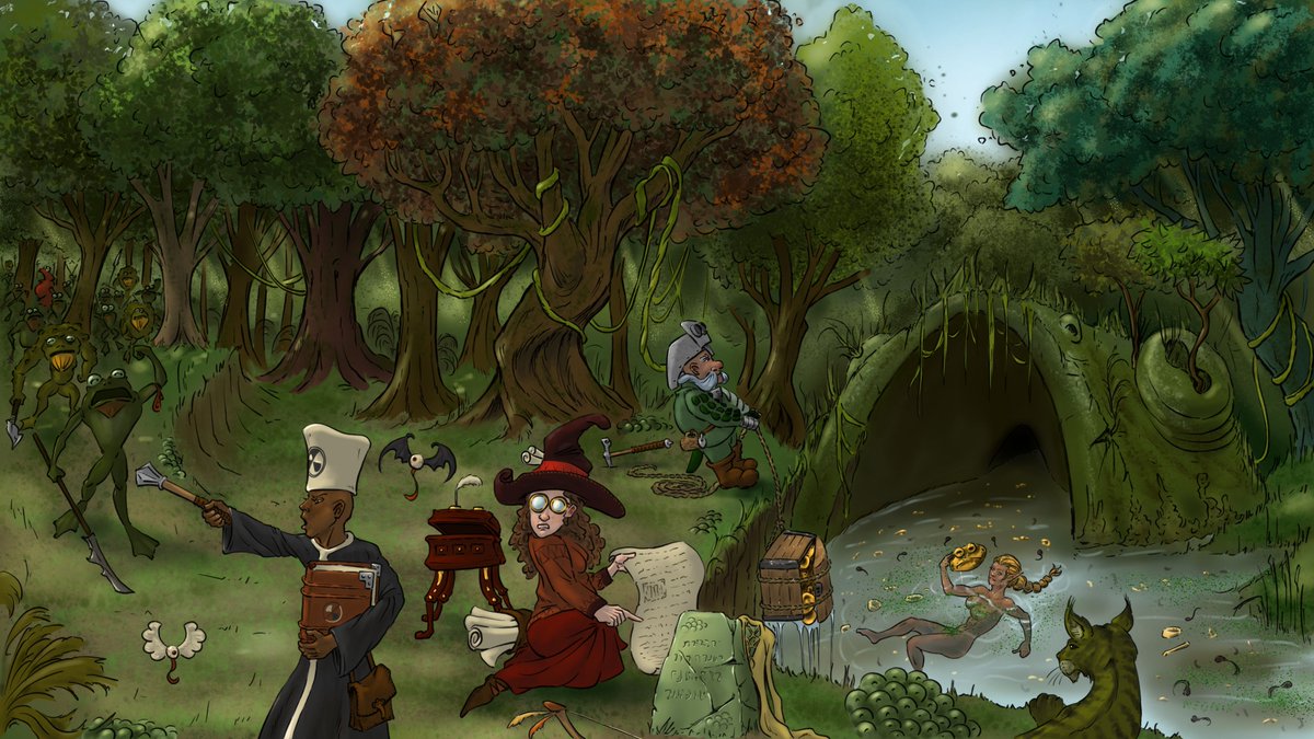 Pond Of the Golden Polliwogs. Jungle and ruins are allways fun - but so much work ... #fantasyart #dnd #illustration #dndart #bullywug #characterdesign #landscape