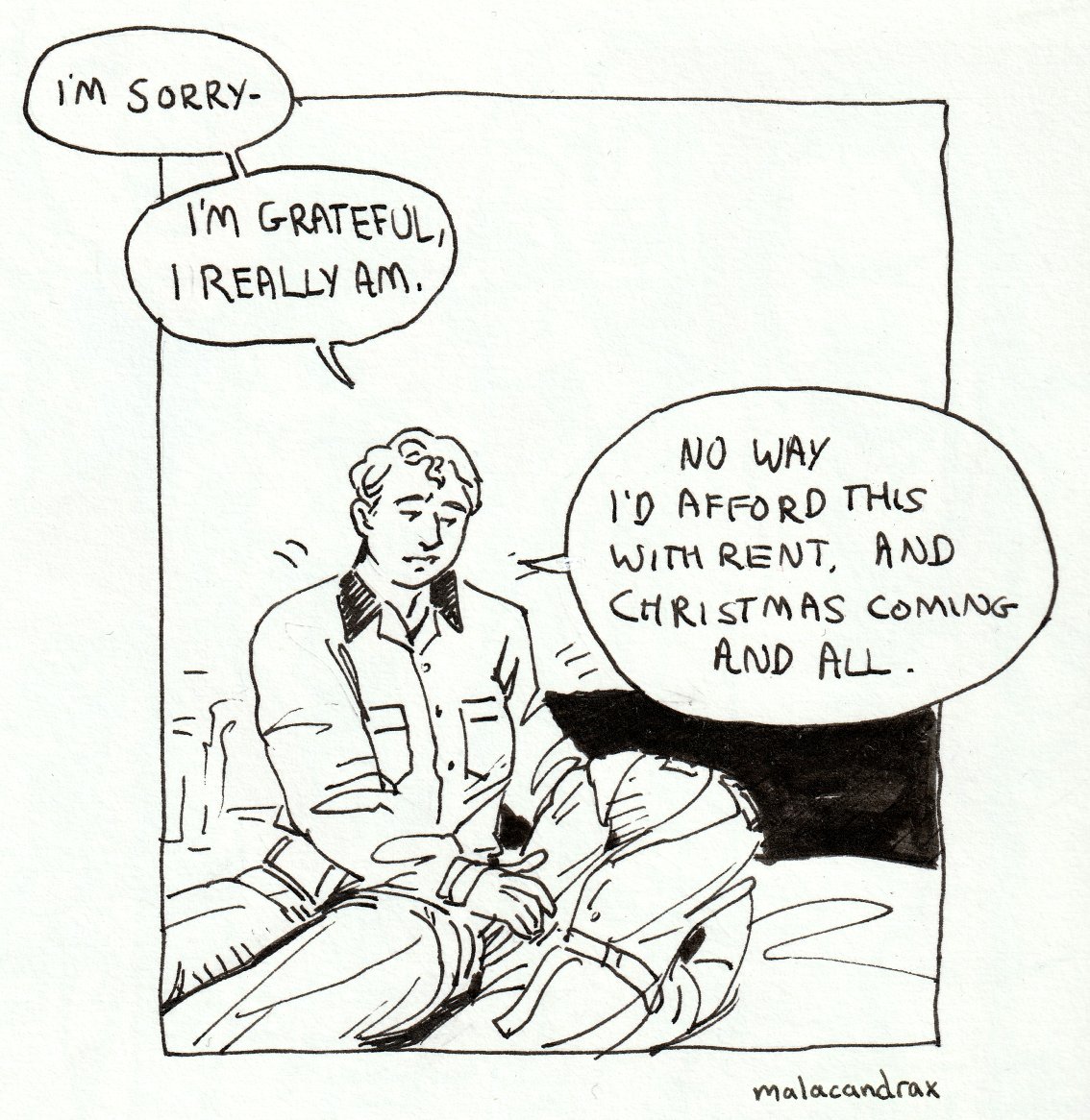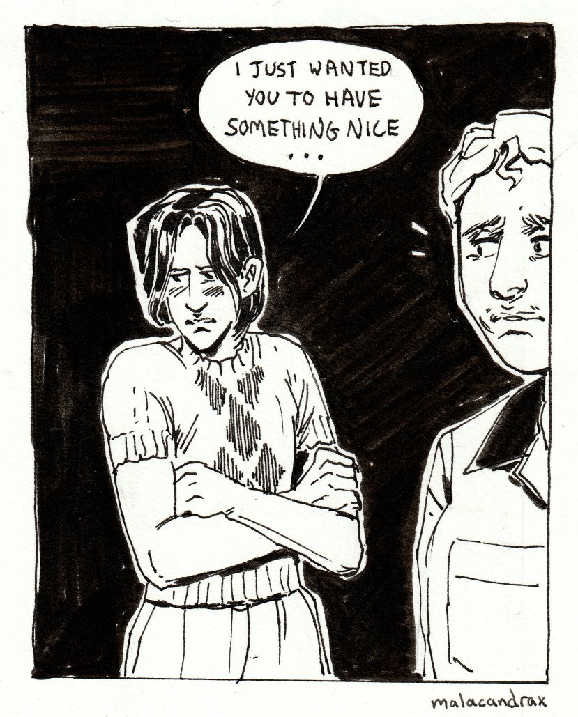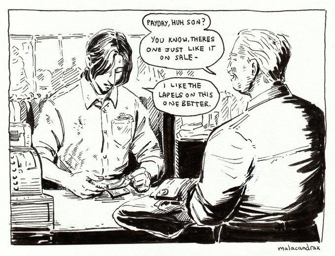 Drawtober #17 [THREAD- TBC] A gift 🎁 Featuring Billie & Bertha again (both she/her) set in the 50's. I read Boots of Leather, Slippers of Gold and it totally inspired their dynamic- "Two butches could be friends, but never lovers." #drawtober2021 #drawtober #butchtober